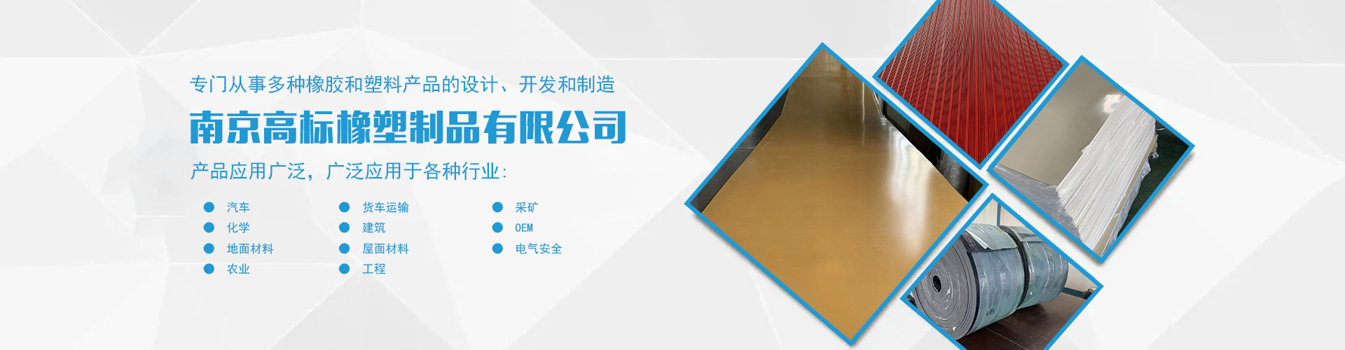 南京高標(biāo)橡塑制品有限公司是一家專(zhuān)業(yè)的橡膠板、橡膠制品和熱塑性塑料產(chǎn)品的制造商。主營(yíng)產(chǎn)品:三元乙丙橡膠板,丁腈橡膠版,氯丁橡膠板,丁苯橡膠板,丁基橡膠板,天然橡膠板,硅橡膠板,氟橡膠板,絕緣,防靜電,導(dǎo)電橡膠板,夾布,夾金屬網(wǎng)橡膠板,耐酸堿橡膠板,耐油橡膠板,耐磨橡膠板,阻燃橡膠板,阻尼橡膠板,減震橡膠板,防滑橡膠板,橡膠墊片等。 高標(biāo)橡塑專(zhuān)門(mén)從事多種橡膠和塑料產(chǎn)品的設(shè)計(jì)、開(kāi)發(fā)和制造。我們的產(chǎn)品應(yīng)用廣泛。廣泛應(yīng)用于各種行業(yè),包括:汽車(chē),貨車(chē)運(yùn)輸,采礦,化學(xué),建筑,OEM,地面材料,屋面材料,電氣安全,農(nóng)業(yè),工程等。 高標(biāo)橡塑的客戶(hù)服務(wù)于許多行業(yè),包括墊片切割、分銷(xiāo)商、工業(yè)用品零售商和批發(fā)商。自